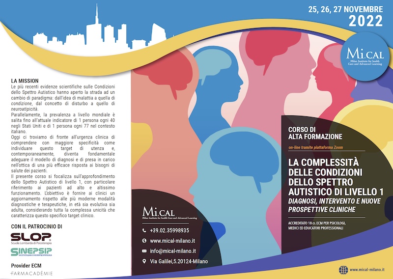 Le più recenti evidenze scientifiche sulle Condizioni dello Spettro Autistico hanno aperto la strada ad un cambio di paradigma: dall’idea di malattia a quella di condizione, dal concetto di disturbo a quello di neuroatipicità. Parallelamente, la prevalenza a livello mondiale salita fino all’attuale indicatore di 1 persona ogni 40 negli Stati Uniti e di 1 persona ogni 77 nel contesto italiano. Oggi ci troviamo di fronte all’urgenza clinica di comprendere con maggiore specificità come individuare questo target di utenza e, contemporaneamente, diventa fondamentale adeguare il modello di diagnosi e di presa in carico nell’ottica di una più efficace risposta ai bisogni di salute dei pazienti. Il presente corso si focalizza sull’approfondimento dello Spettro Autistico di livello 1, con particolare riferimento ai pazienti ad alto e altissimo funzionamento. L’obiettivo è fornire ai clinici un aggiornamento rispetto alle più moderne modalità diagnostiche e terapeutiche, in età sia evolutiva sia adulta, considerando tutta la complessa unicità che caratterizza questo specifico target clinico.