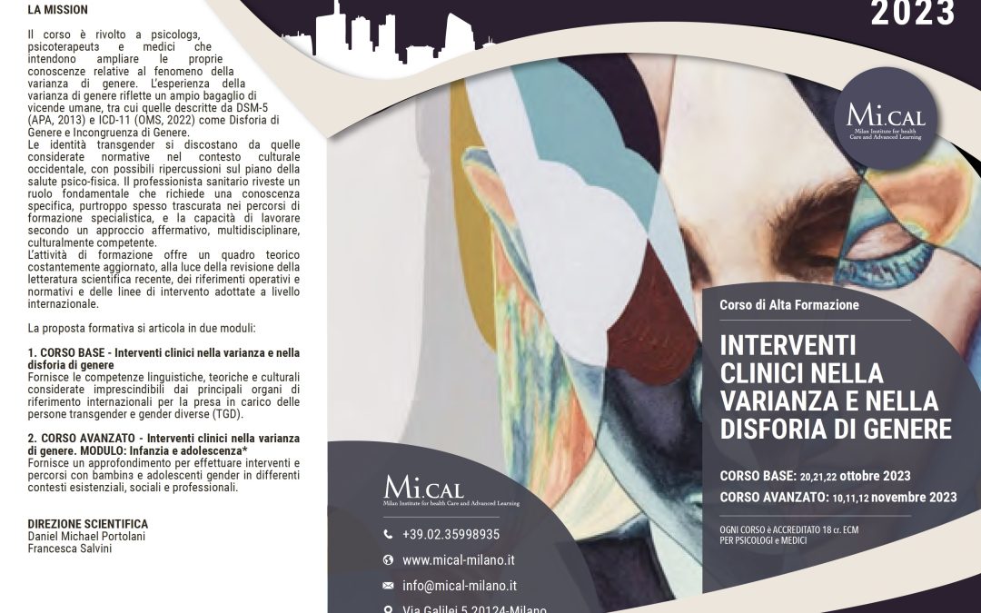 Il corso è rivolto a psicologз, psicoterapeutз e medici che intendono ampliare le proprie conoscenze relative al fenomeno della varianza di genere. L’esperienza della varianza di genere riflette un ampio bagaglio di vicende umane, tra cui quelle descritte da DSM-5 (APA, 2013) e ICD-11 (OMS, 2022) come Disforia di Genere e Incongruenza di Genere. Le identità transgender si discostano da quelle considerate normative nel contesto culturale occidentale, con possibili ripercussioni sul piano della salute psico-fisica. Il professionista sanitario riveste un ruolo fondamentale che richiede una conoscenza specifica, purtroppo spesso trascurata nei percorsi di formazione specialistica, e la capacità di lavorare secondo un approccio affermativo, multidisciplinare, culturalmente competente. L’attività di formazione offre un quadro teorico costantemente aggiornato, alla luce della revisione della letteratura scientifica recente, dei riferimenti operativi e normativi e delle linee di intervento adottate a livello internazionale.